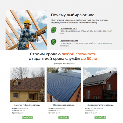 Сайт включает разделы о видах работ, материалах, портфолио и отзывах клиентов. Внедрили систему онлайн-заявки и калькулятор расчёта стоимости. Сайт адаптирован под все устройства и оптимизирован.